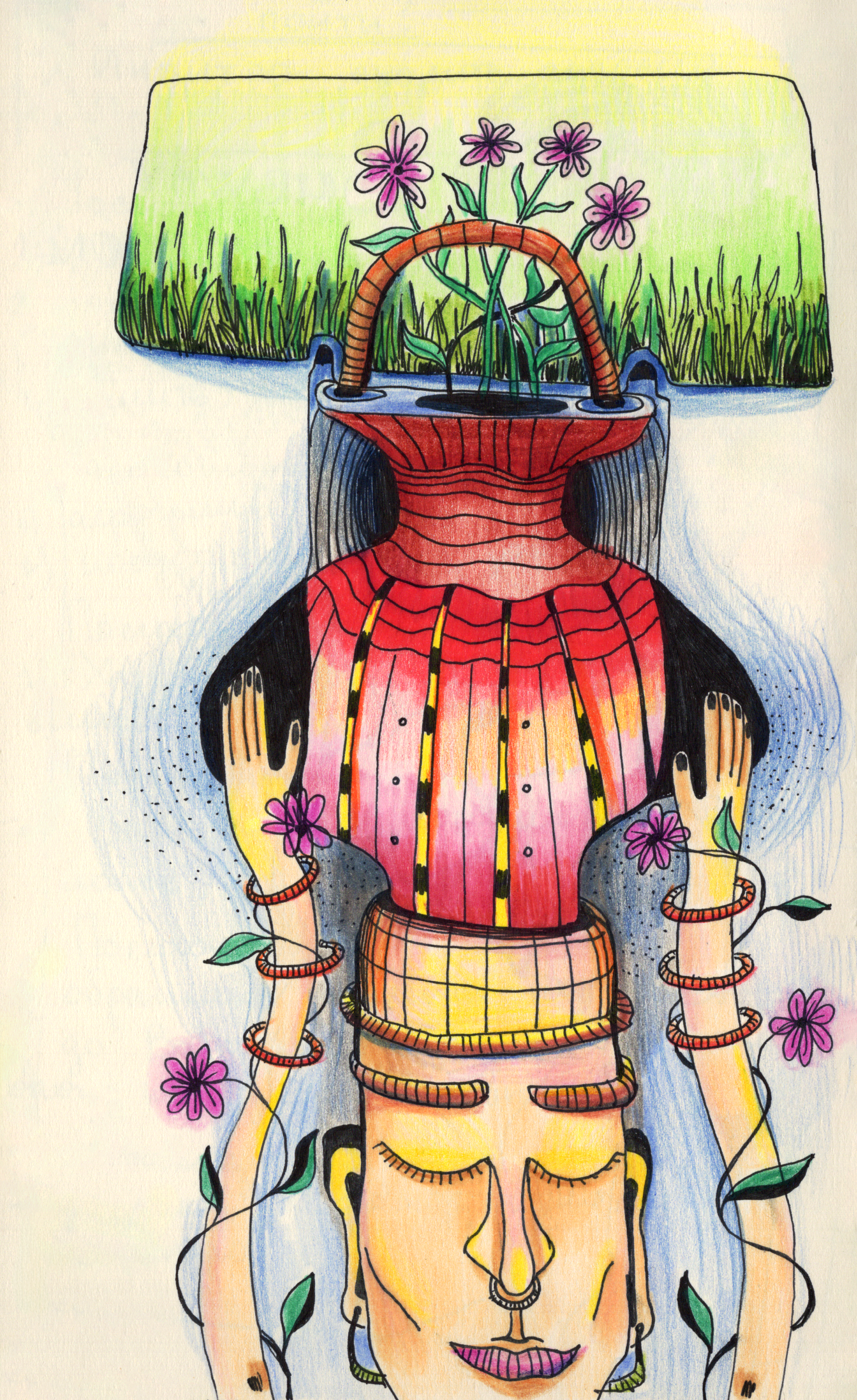 Composed through layers of Posca markers, acrylic paint, black gel ink, and colored pencil, the artworks unfold through color, line, and delicate texture.